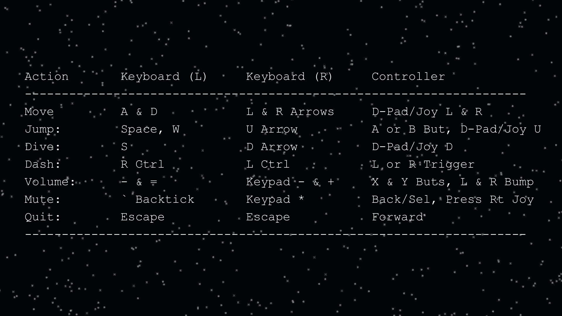 Supports controller (recommended) or keyboard (left or right-handed). Be sure to use your dash (Ctrl or Trigger) to go faster and also jump much higher. Press Esc to exit the game, then relaunch to select different options.